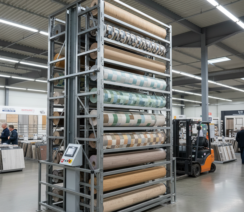 Ищете где приобрести стойку для линолеума? ООО «ПРОМСПЕЦСЕРВИС» предлагает вам современный вертикальный стеллаж-патерностер, разработанный специально для оптимального хранения и эффектной демонстрации напольных покрытий.